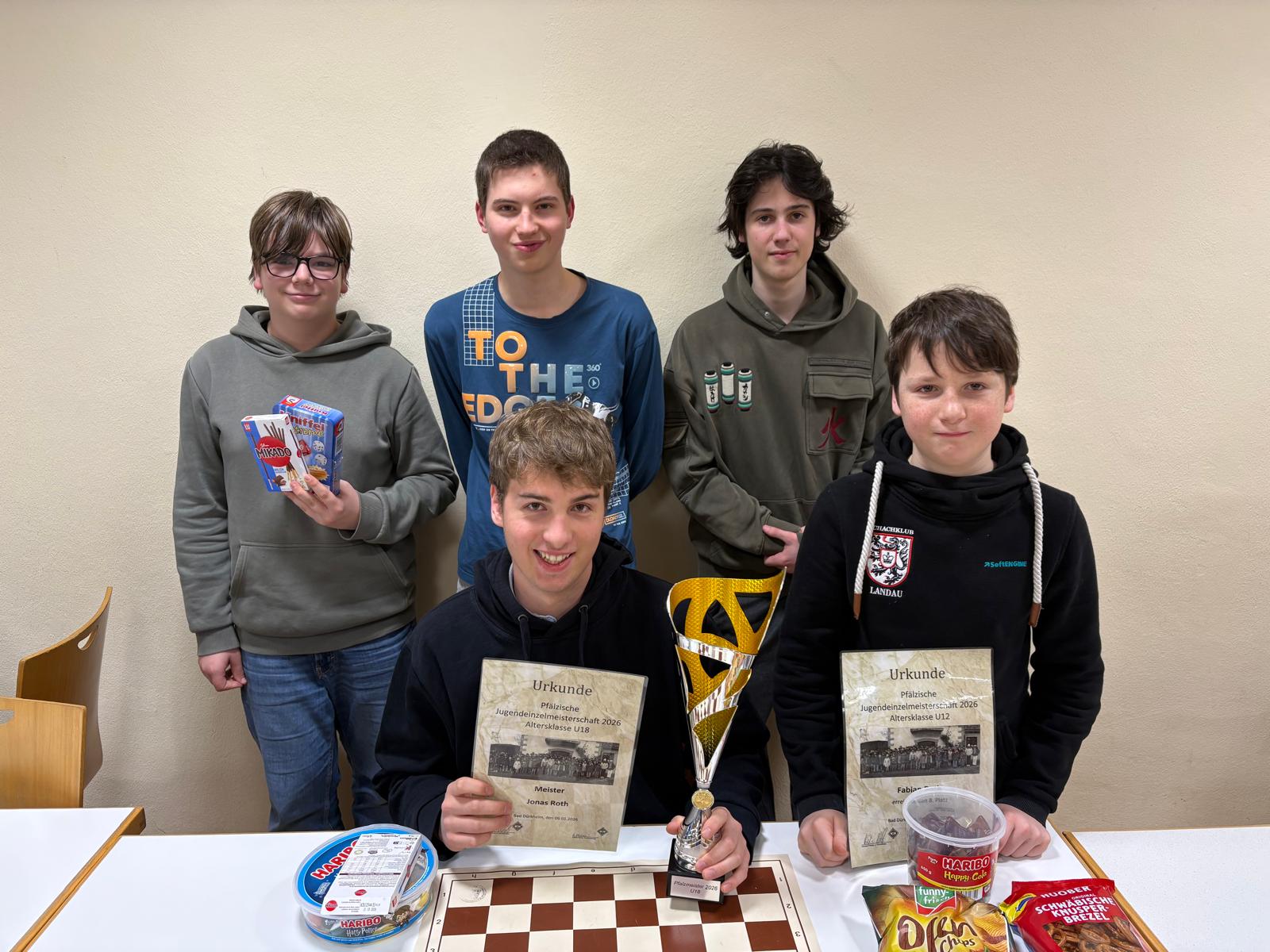 Mit souveränen 6,5 Punkten aus 7 Partien gelang unserem Recken Jonas Roth die Meisterprüfung im Jugendbereich: Pfalzmeister bei den Ältesten der U18 im Jugendbereich. Mit 2 Punkten Rückstand folgte erst die Konkurrenz. Nach Siegen über David Schaser (Weilerbach), Isabell Rykeit (Haßloch) folgte das einzige Remis gegen Nicolas Wagener (Limburgerhof). Nach weiteren Siegen über Lars Vollmer (Frankenthal), Milan Schneble (Birkenfeld) und Rajit Majumdar (Kaiserslautern) stand Jonas schon nach 6...